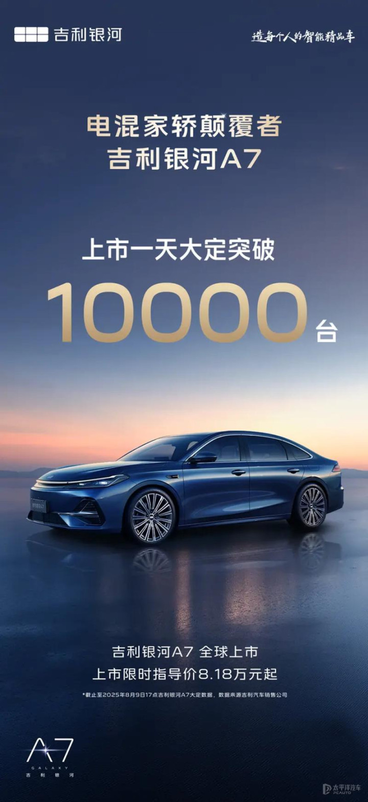 近期,吉利银河官方宣布吉利银河A7上市一天大定突破10000台。新车在8月7日上市,款车型的价格区间为8.98-12.58万元,限时先享价8.18-11.78万元。吉利银河A7是首款基于GEA新能源架构打造的插混轿车,首发搭载雷神AI电混2.0、全新银河Flyme Auto智能座舱系统。车辆在CLTC工况下百公里馈电油耗为2.67L,综合续航超2100km。