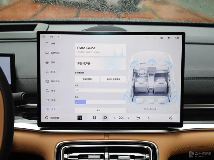 其次“三潭印月” 悬浮音响嵌入座舱,配合 Flyme Sound 无界之声系统(16 扬声器 + 1000W 功放 + 头枕音响),7.1 立体环绕声带来沉浸式听觉体验;256 色星瀑式氛围灯可随场景联动,同时搭载50W手机无线快充。