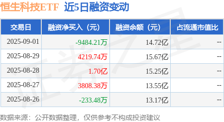 本站消息,9月1日,恒生科技ETF(513130)融资买入10.25亿元,融资偿还11.19亿元,融资净卖出9484.21万元,融资余额14.72亿元,近20个交易日中有12个交易日出现融资净买入。